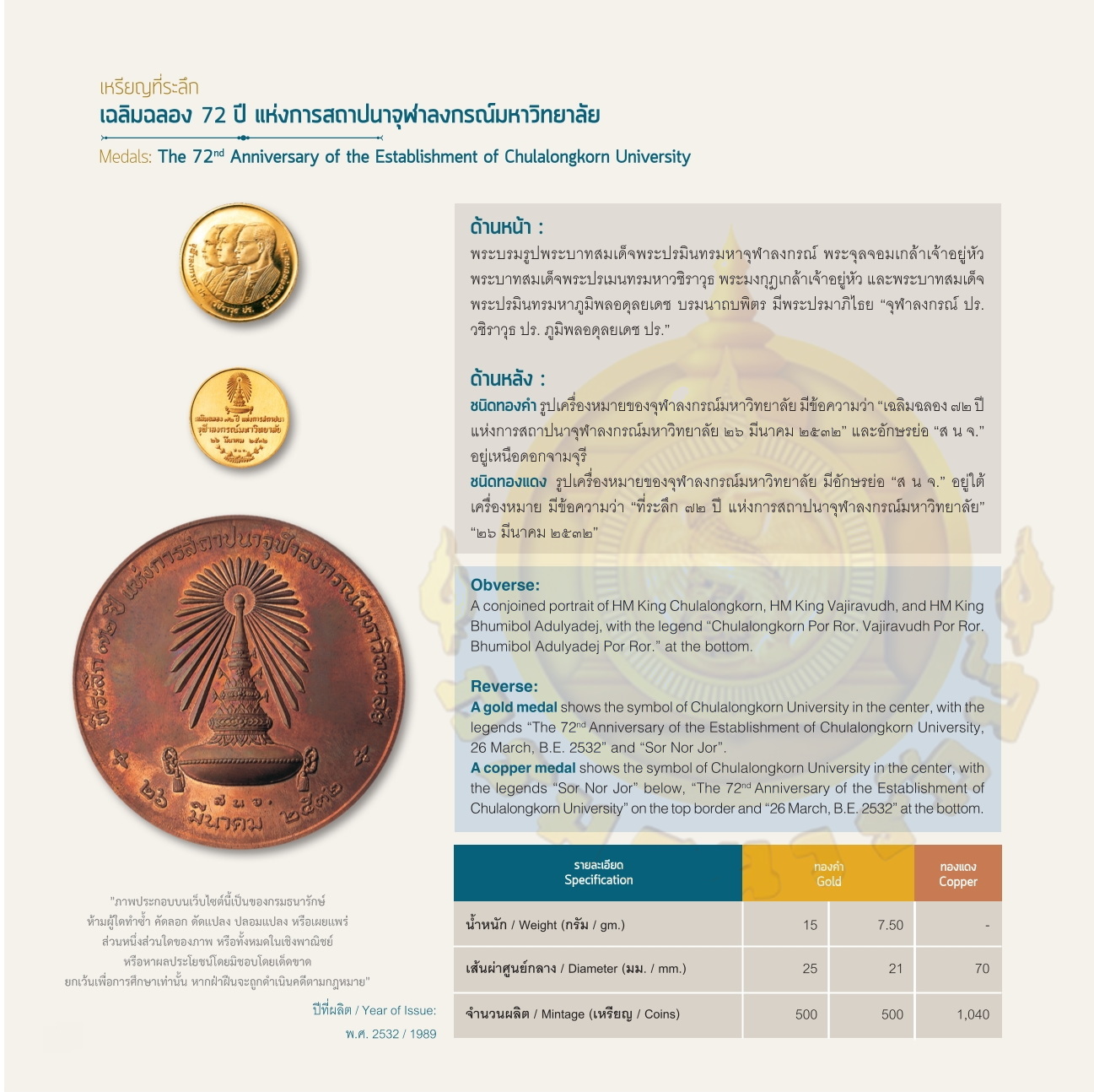 เหรียญทองแดง ที่ระลึก เฉลิมฉลอง 72 ปี แห่งการสถาปนาจุฬาลงกรณ์มหาวิทยาลัย (ขนาด 7 ซม)